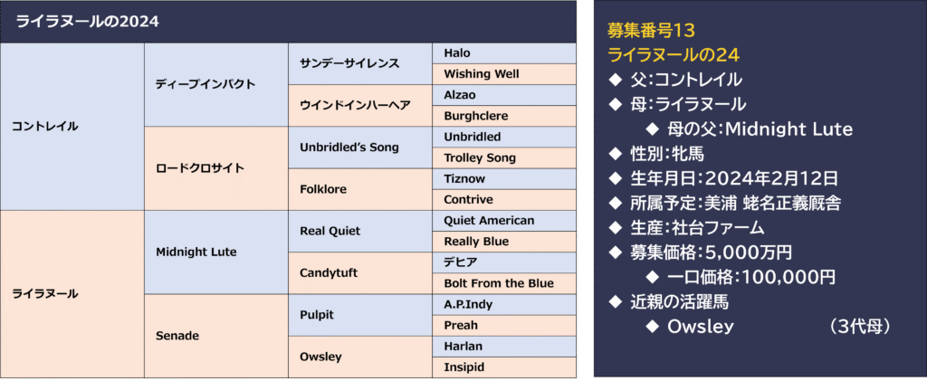 ライラヌールの24は父コントレイル、母の父Midnight Luteという配合の牝馬です。