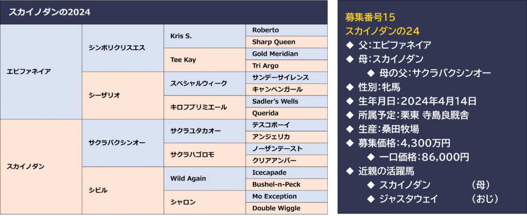 スカイノダンの24は父エピファネイア、母の父サクラバクシンオーという配合の牝馬です。
