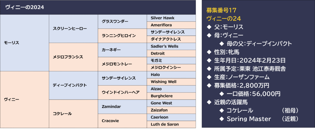 ヴィニーの24は父モーリス、母の父ディープインパクトという配合の牝馬です。