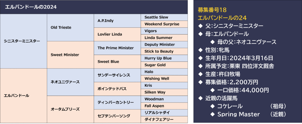 エルパンドールの24は父シニスターミニスター、母の父ネオユニヴァースという配合の牝馬です。