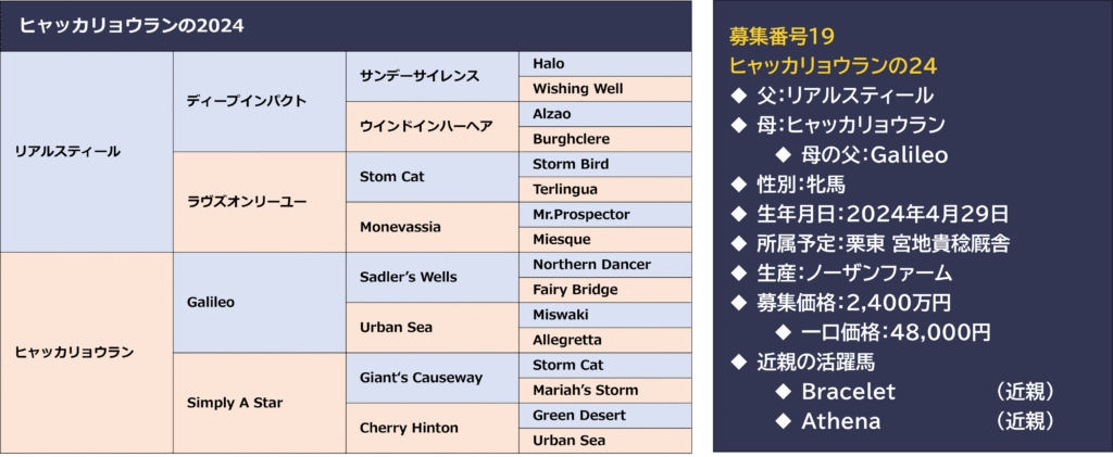 ヒャッカリョウランの24は父リアルスティール、母の父Galileoという配合の牝馬です。