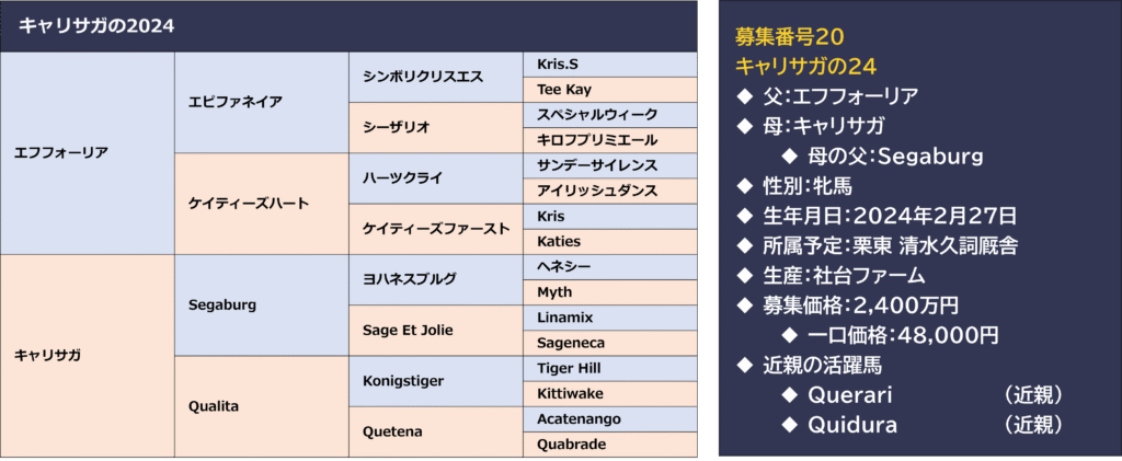 キャリサガの24は父エフフォーリア、母の父Sageburgという配合の牝馬です。