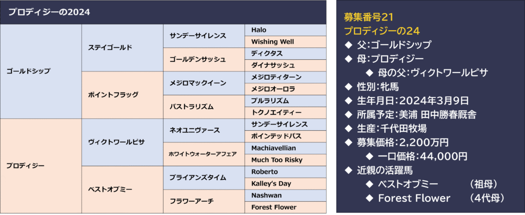 プロディジーの24は父ゴールドシップ、母の父ヴィクトワールピサの牝馬です。